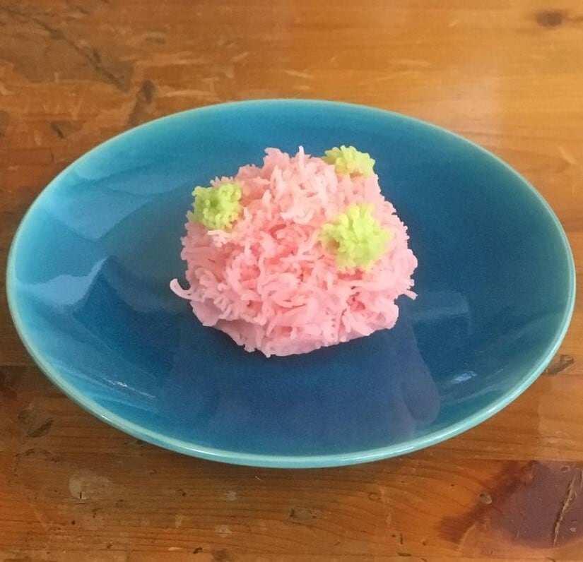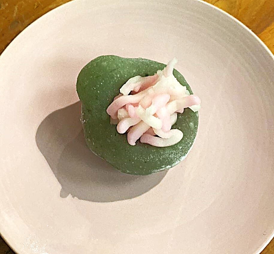 紅色が白餡、白色が味噌餡、緑色が蓬でこし餡